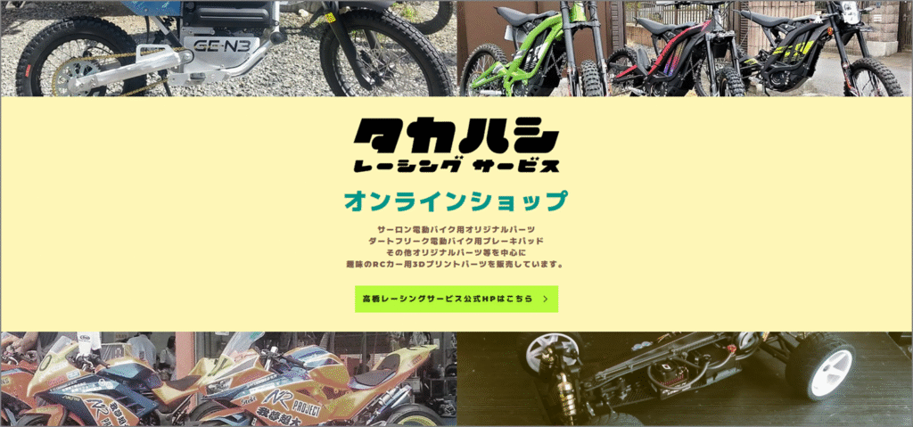 Facebook postLINE ようこそ!高橋レーシングサービスのホームページへ! レーシングサービス レース用オートバイをメインとしたサービスをご提供させて頂きます。当店は代理店です。 ヘッドライトリペア 他店とは一味違ったヘッドライトリペアをご提供させて頂きます。 ヘッドライトリペアに関するQ&A SUR-RON 電動オフロードバイク 世界各国で絶大な人気を誇る電動オフロードバイク【サーロン】当店は国内正規販売店第一号店です。 ヨツバモト キッズ用電動ダートバイク 3歳から始められるモータースポーツとして人気のキッズ用電動バイク【ヨツバモト】のプロパートナー店です。 オートバイメンテナンスサービス 自動車整備士(二級ガソリン・ディーゼル自動車整備士)、レースメカニックの経験を活かしたサービスを提供いたします。現在は250㏄未満まで受付となります(レース用車両は制限無しです)。 その他 長年の整備士経験を活かしたサービスをご提供させて頂きます。 YouTubeチャンネル ヘッドライトリペア作業、SUR-RONダートバイク、ヨツバモト関連情報等を不定期に発信します。 オンラインショップ 当店オリジナルパーツ、ブレーキパッド、補修パーツの他、趣味のRCカー用3Dプリントパーツも販売しています。 Facebook postLINE